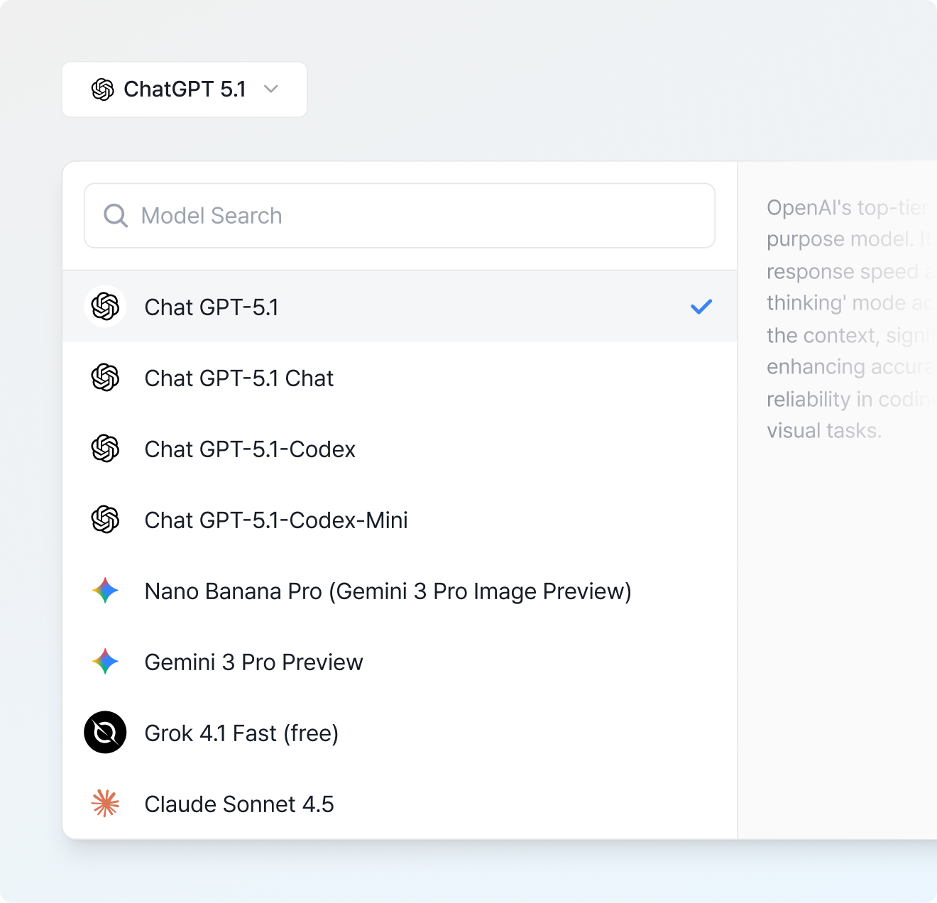 Each model offers unique strengths. From creative writing to long-document summaries and Google-based insights, choose what fits your task and switch freely.